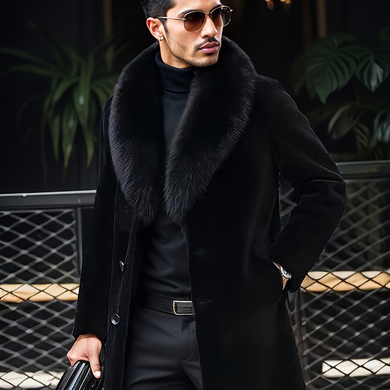 TEMU 남성 패션 캐주얼 비즈니스 파티 보리 칼라 블랙 인조 퍼 겨울 코트, 플러시 코트, 인조 토끼 퍼, 편안하고 부드러운 따뜻한 롱 코트