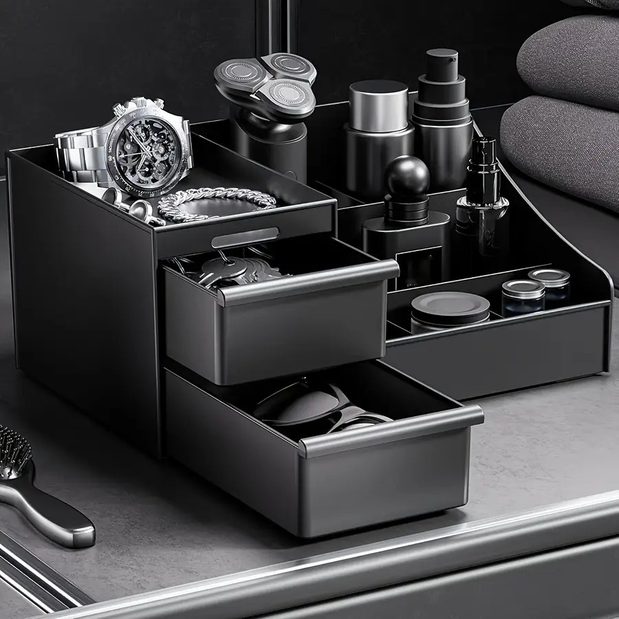 TEMU 남성용 다기능 플라스틱 화장품 보관함 - 욕실 정리함, 주얼리 & 시계 홀더, 향수 디스플레이, 메이크업 브러시 및 면도기 수납 - 공간 절약형 카운터탑 트레이, 내구성 있는 블랙 플라스틱 제작, 조립 불필요, 남성을 위한 이상적인 홈 데코 선물