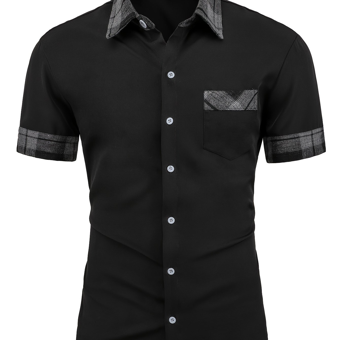 TEMU 남성용 캐주얼 체크무늬 버튼업 셔츠 - 반팔, 블랙 & 화이트 폴리에스터 원단, 클래식 칼라, 세탁기 사용 가능, 캐주얼 의상에 완벽, 다용도 레이어링 피스 | 클래식 체크 셔츠 | 만다린 칼라 셔츠